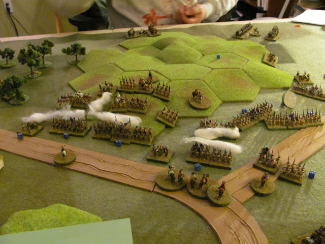 they were losing a company and thus a die for each 2 casualties but needed to inflict 4 hits to do the same to the enemy). Eventually, numbers told and the remaining Voltigeurs were compelled to fall back and the Fencibles stepped into the gap. An attempt by the the 1st Infantry to break through was easily repulsed and the remaining companies eyed each other warily across the bridge and awaited events elsewhere.